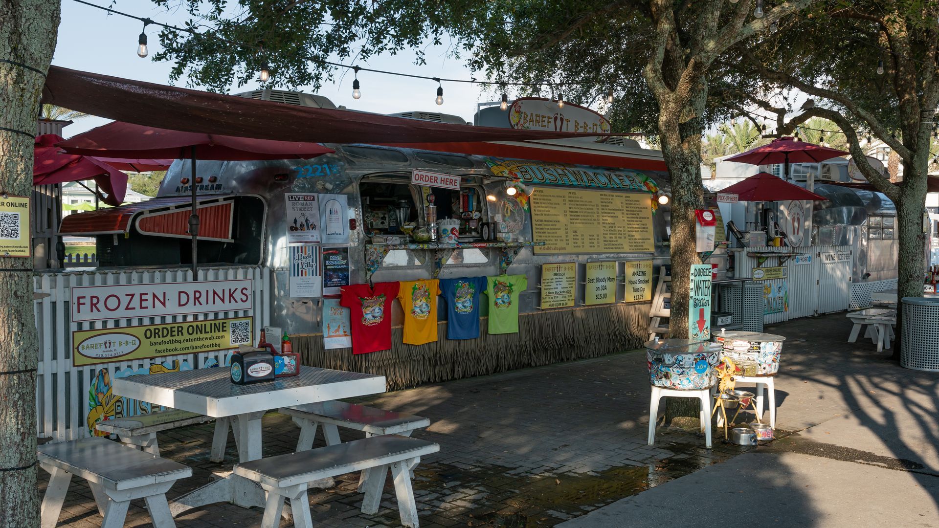 ButtonA series of food trucks line the road in Seaside, Florida, along hiway 30A.