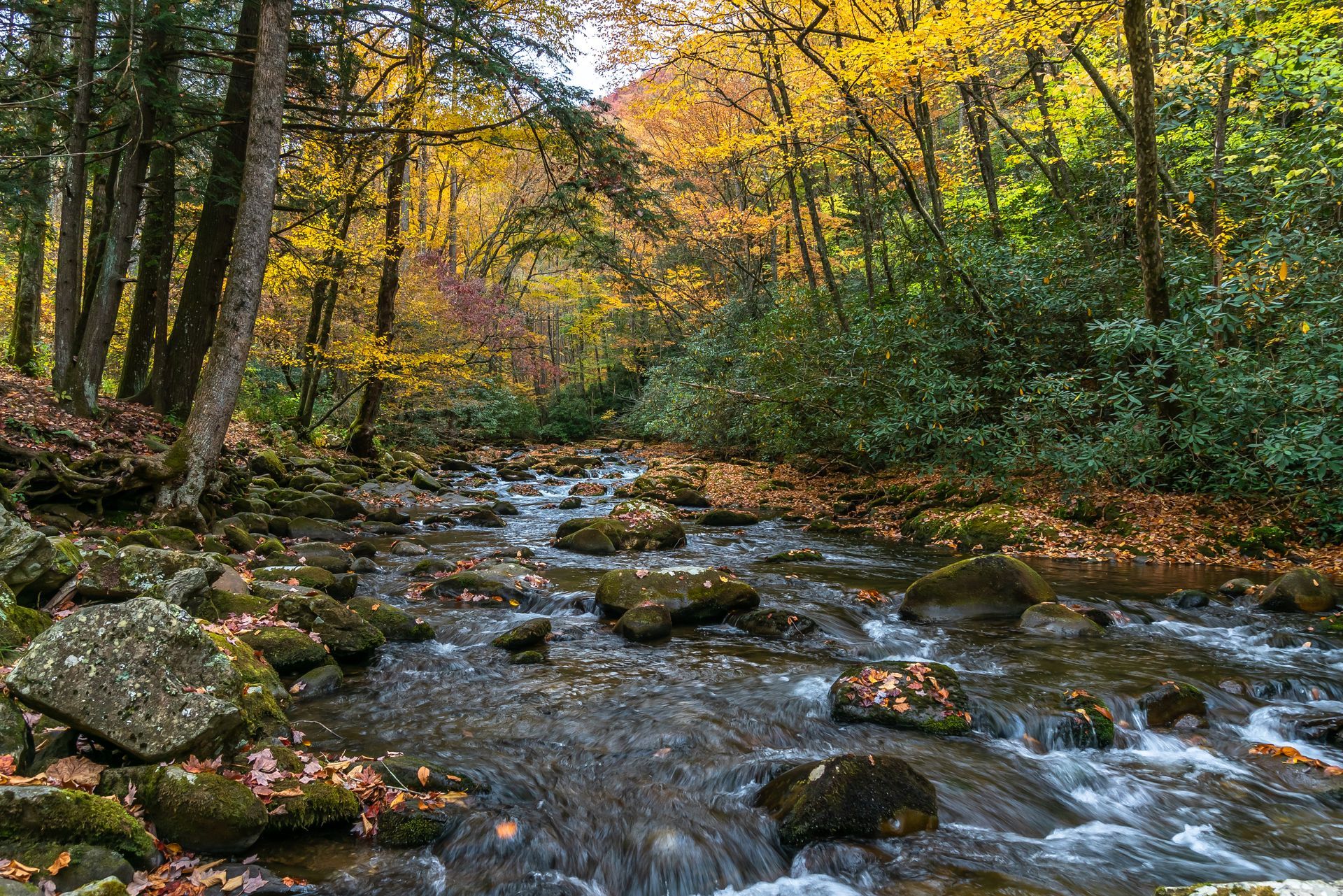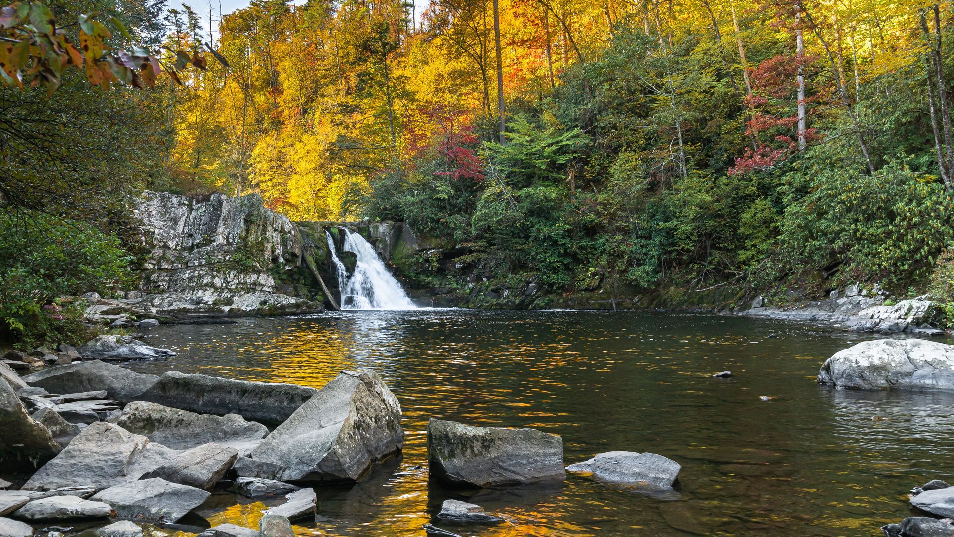 ButtonIn the Great Smoly Mountains National Park, Abrams Falls in autumn colors