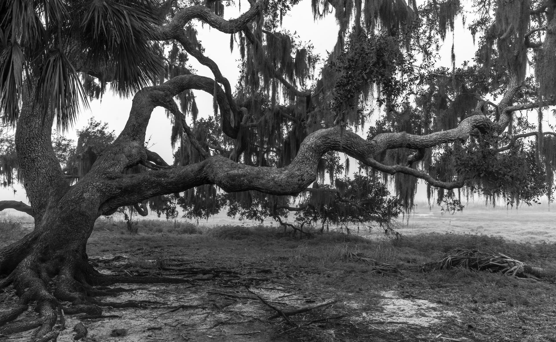 ButtonLive oak tree in Mayakka State Park, Central Florida. Captured on a foggy morning in February this old oak tree appears to be reaching out to the horizon