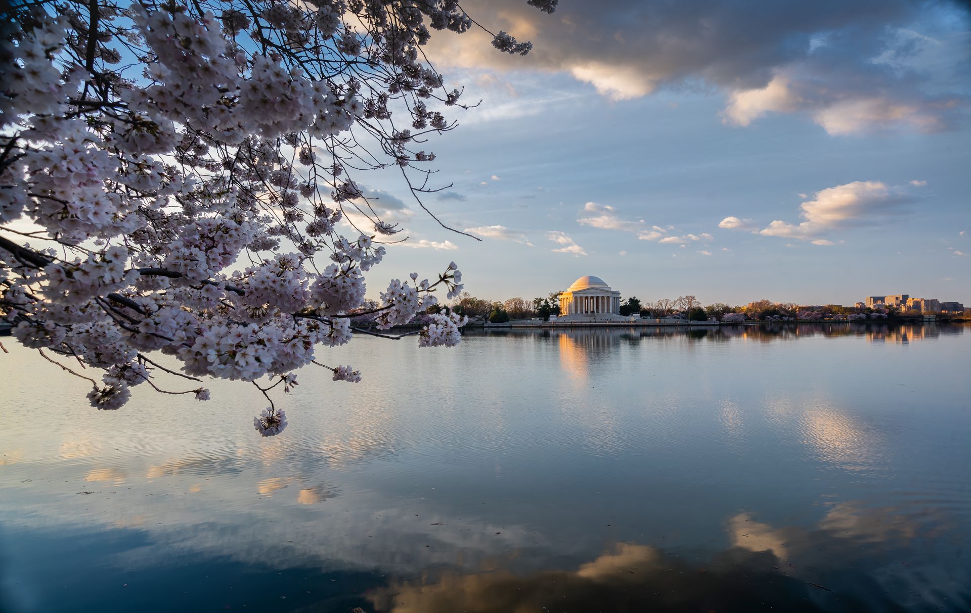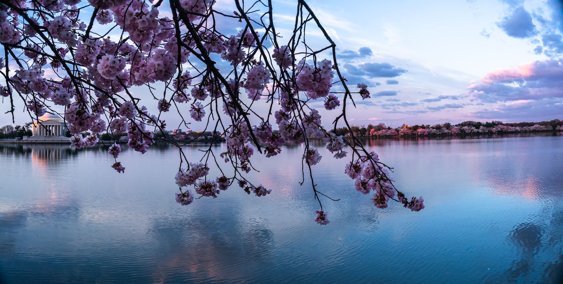 ButtonBlooming Cherry Trees around the Tidal Pool in Washington D.C.