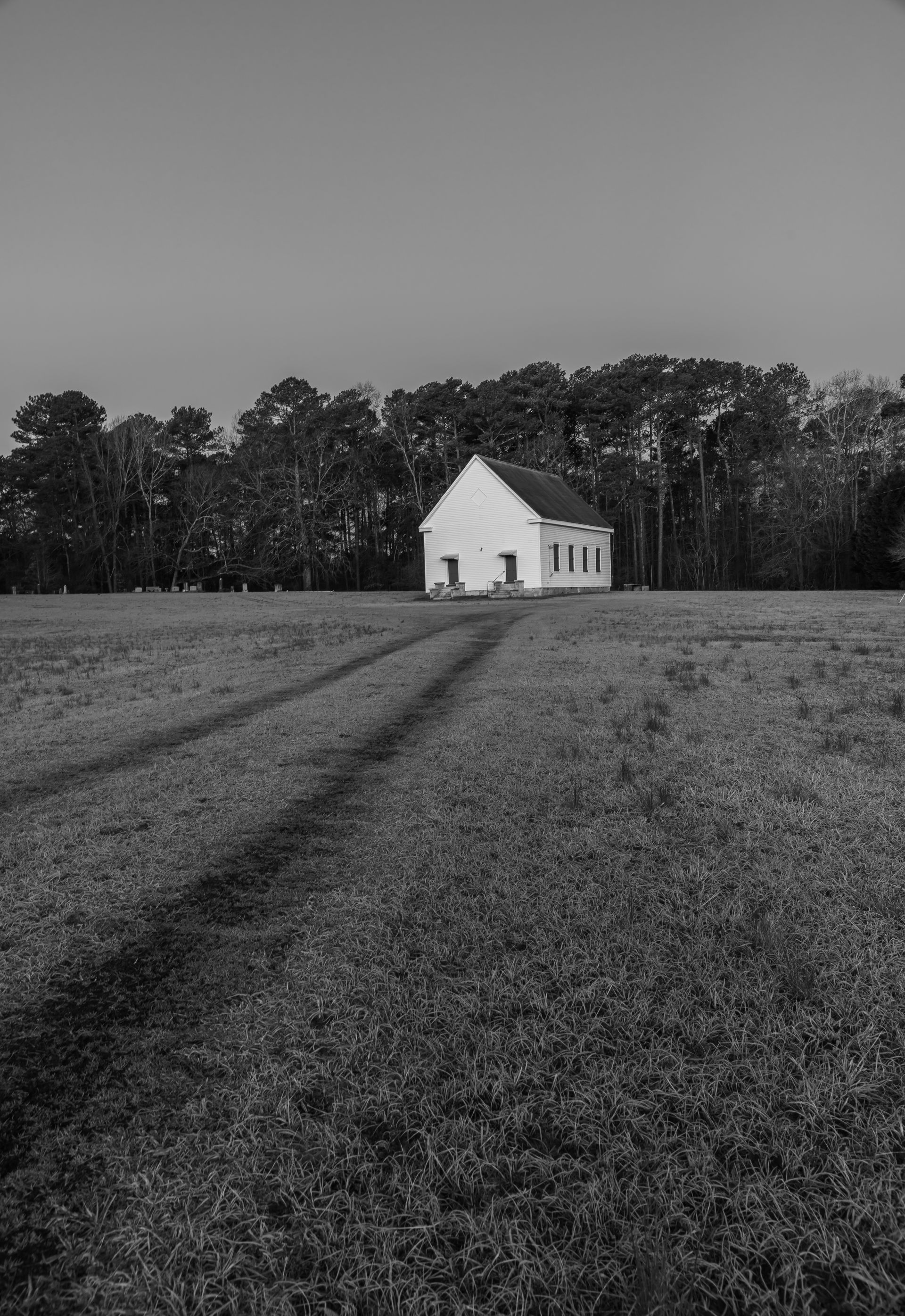 ButtonSalem Metodist Church, Oconee County, Georgia, glows in predawn, monochromatic winter scape.