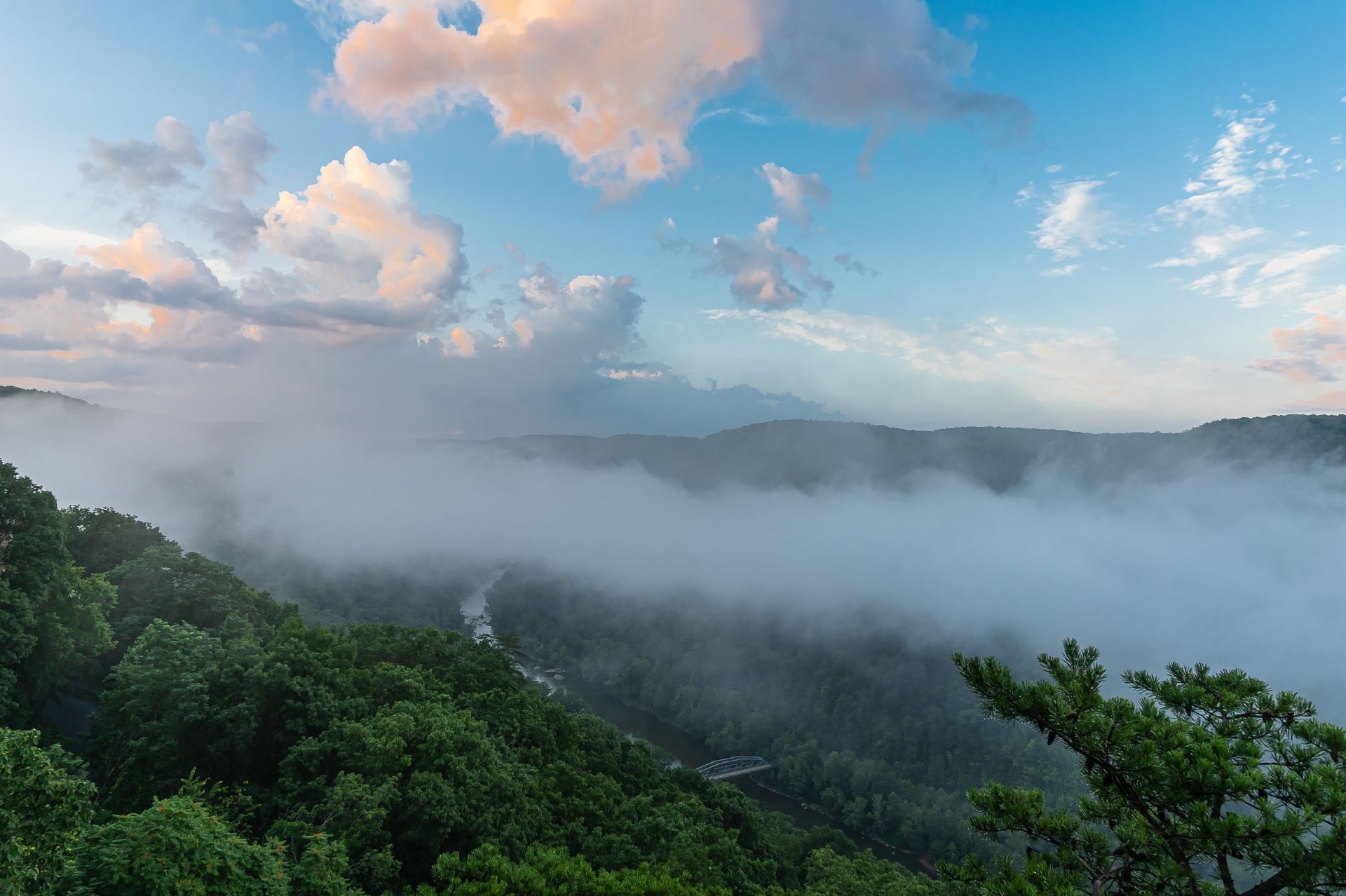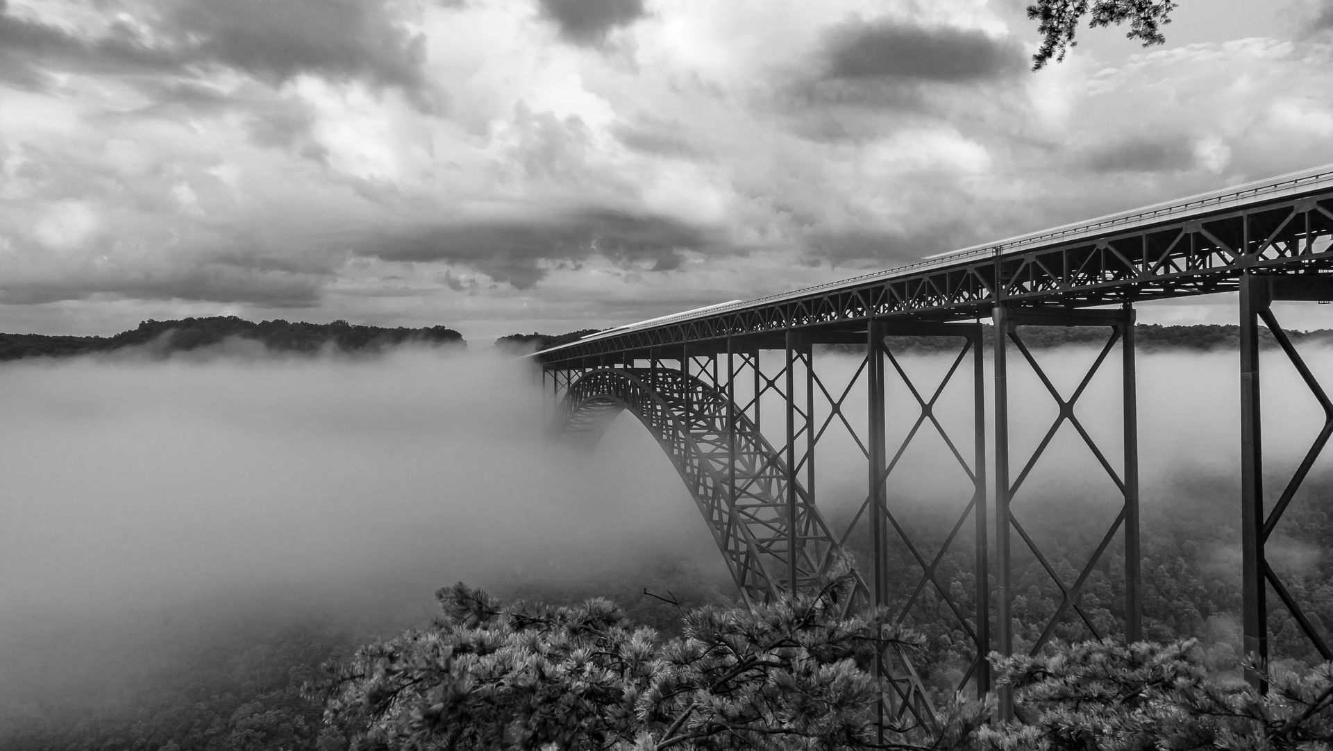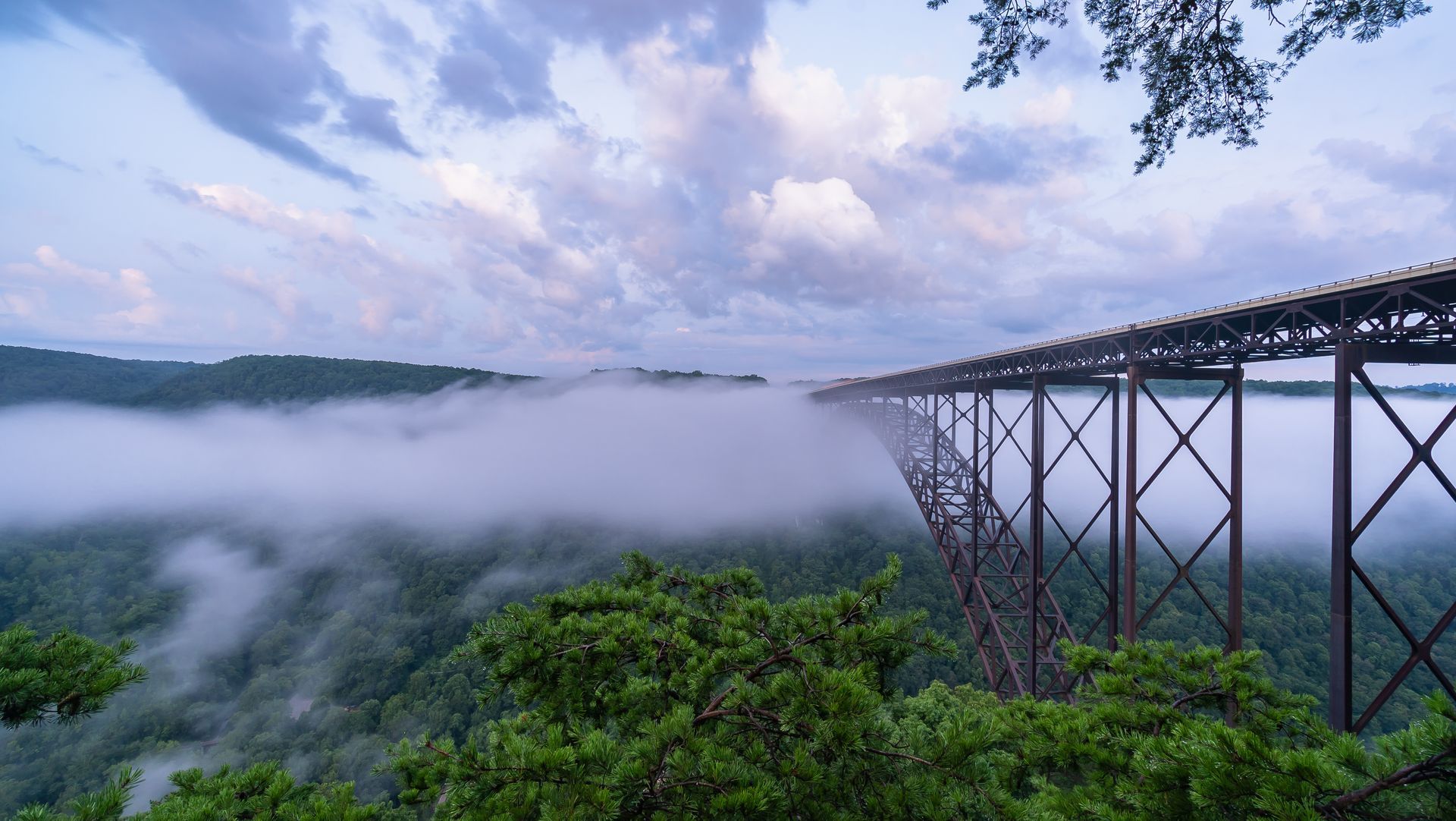 ButtonClouds create ethereal effect around the New River Bridge in Fayetteville, West Virginia